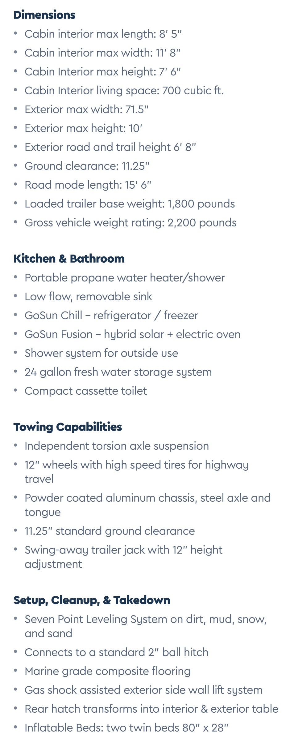 A one of a kind off-grid cabin on wheels, completely integrated with GoSun's breakthrough solar products. Innovative design and super efficient appliances allow you to go much further than traditional campers and RV’s.