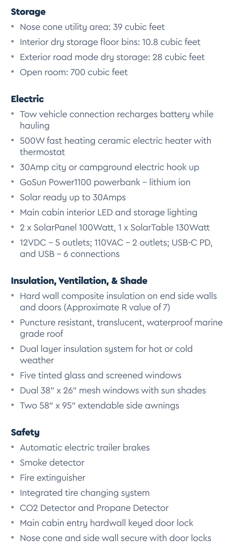 Designed with efficiency in mind to save on storage and gas mileage, the GoSun Camp 365 has the best space to weight ratio on the market. At a weight less than 1,800 lbs and a total collapsed height of 6' 8" - it can easily be stowed in a garage. Tow with virtually any vehicle with a Class 1 hitch.
