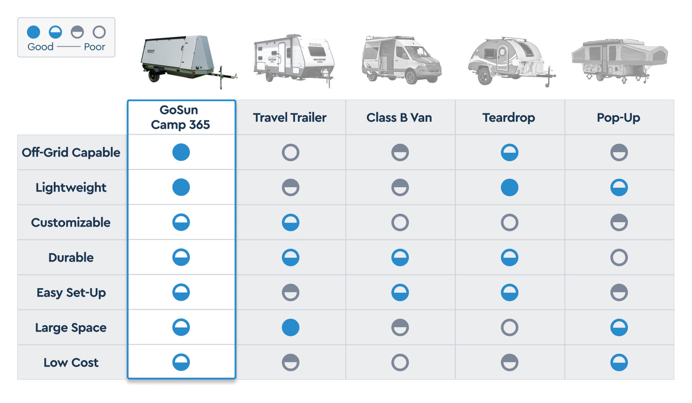 GoSun designs for maximun fun and resilience. Camp365 helps elevate your camp experience and provides the freedom of going off-grid. With the best portability possible in an RV, it's a great fit for your daily driver.