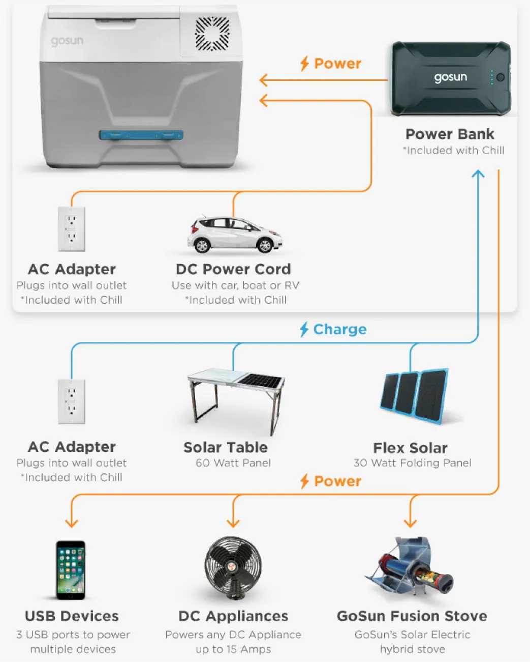 Whether it’s camping, bbq, fishing, or just relaxing in the Sun, we love the outdoors. Nothing kills the trip like rotten food, soggy bread, or warm beer. To keep the adventure going, the Chill minimizes space needed for ice and fuel and maximizes space for fresh food, cold drinks, and fun times. It's like having a fridge on wheels.