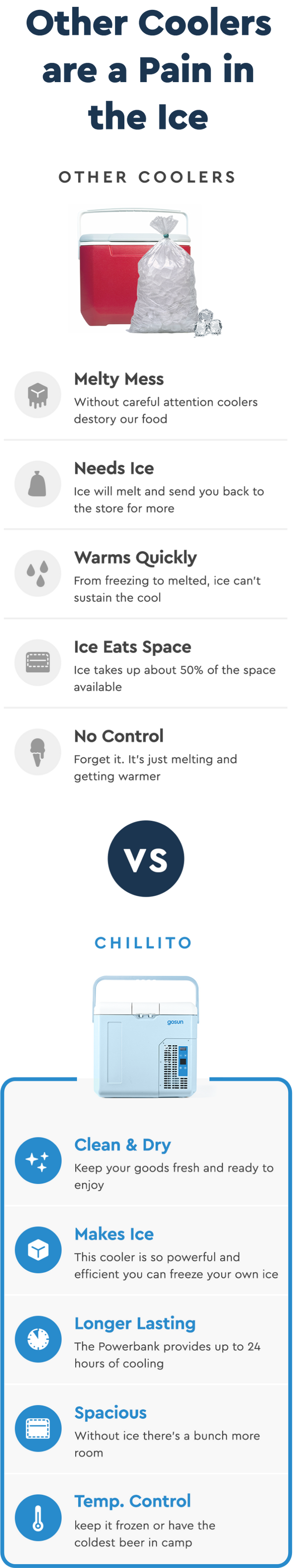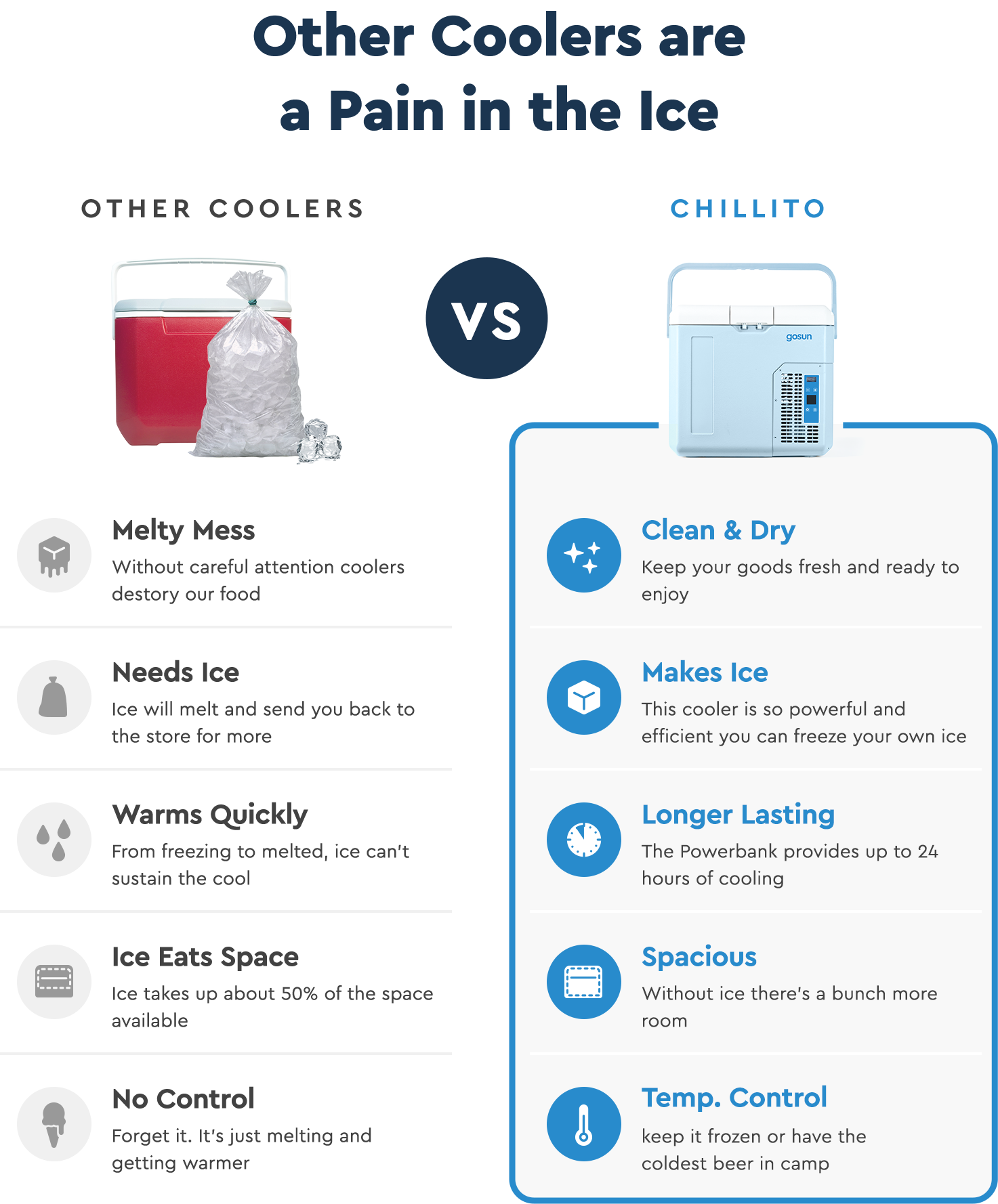 The Chillito solar cooler can be powered by the included Power 144, DC car outlet, or AC adapter.