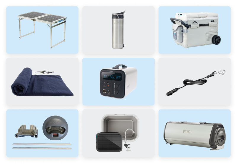 Grid includes all of GoSun's core, top-selling products. Portable and versatile, everything works together to meet your off-grid needs, building independence and resilience. Runs off of 12V, 110V, and Solar Direct.
