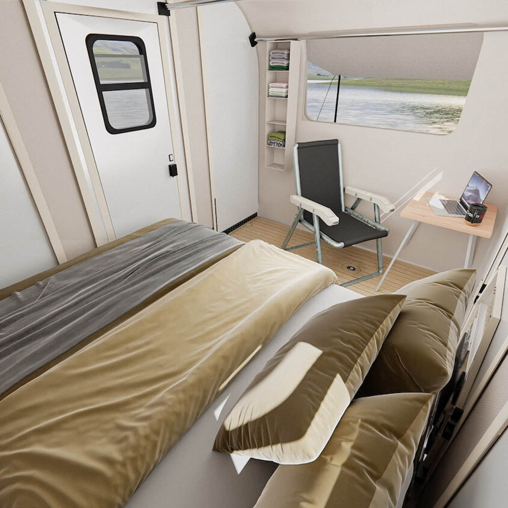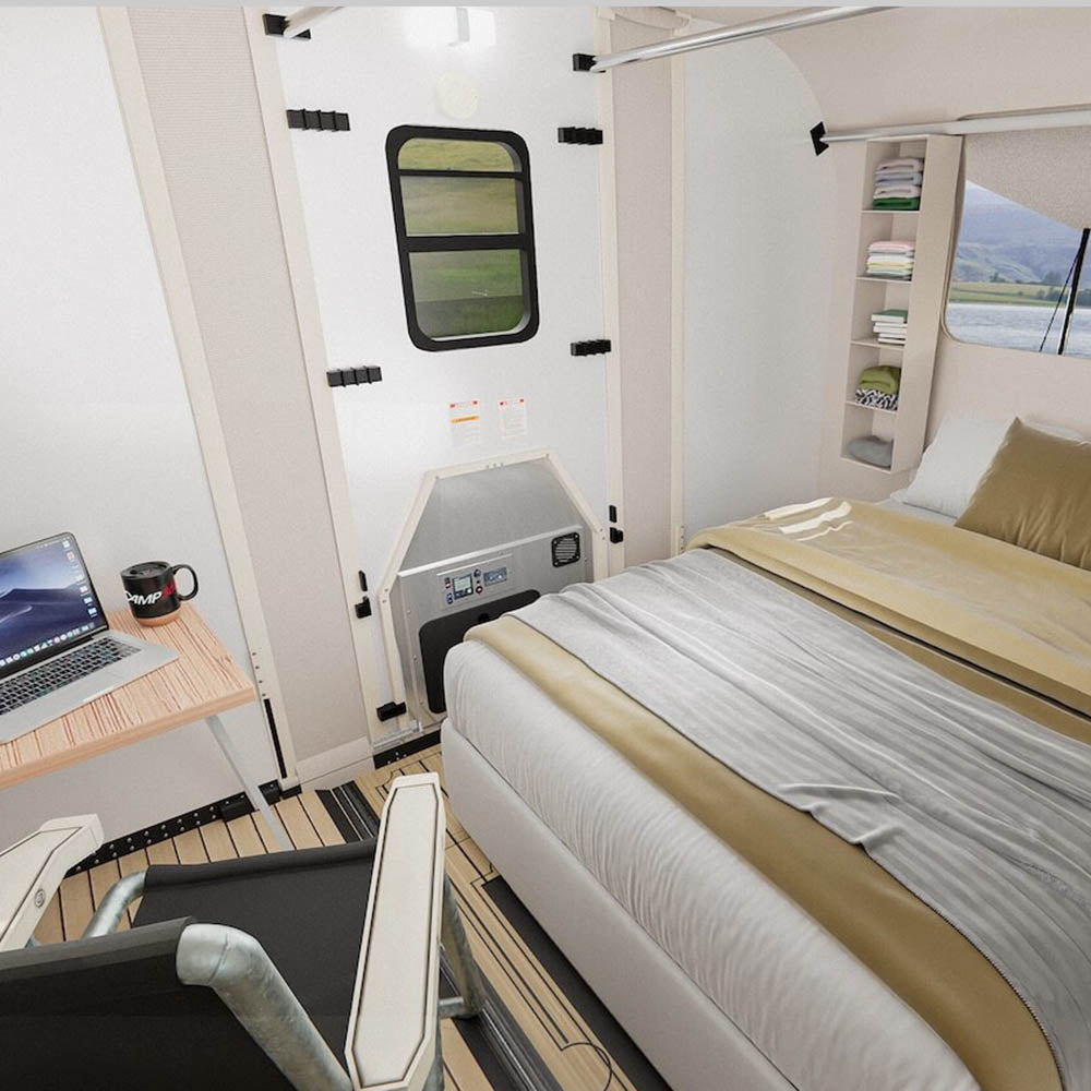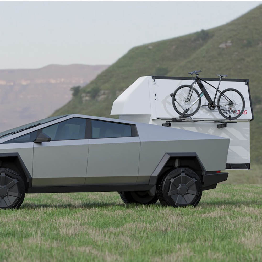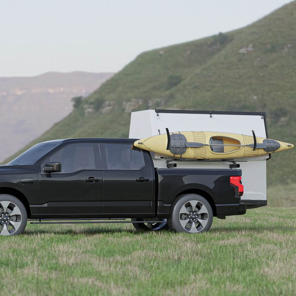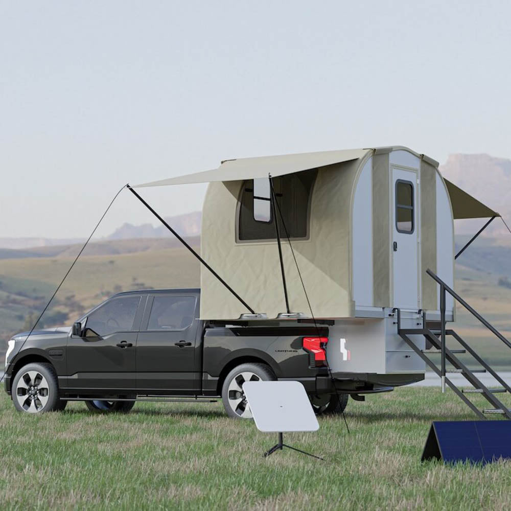 Engineered for how your family wants to camp with an EV pickup truck or any truck! Lightweight, aerodynamic, energy-efficient design for maximum vehicle range. At the campsite, the T-Model unfolds in minutes to a spacious, comfortable, all-season cabin with standing room for dancing, yoga, and large families. T-Model is sustainable and designed with modern-day modular amenities for whole-family off-grid getaways. The T-Model easily detaches from the pickup truck for campsite trips to town or off-roading. When finished tucking into the corner of your garage, it is ready for your next weekend trip. The T-Model transforms your pickup into a true lifestyle mobile office vehicle. Many off grid gosun items included and optional.