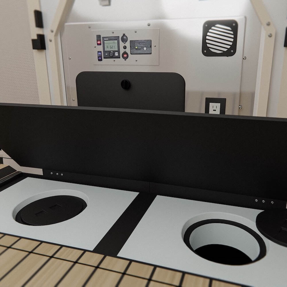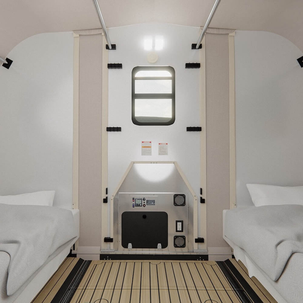 - Eco Flow Wave 2 electric heat (6100 BTU) and air conditioner (5100 BTU) with app control; very quiet for sleeping; heats or cools the cabin in 5 minutes; regenerate with Solar, AC, DC, or car alternator (optional)